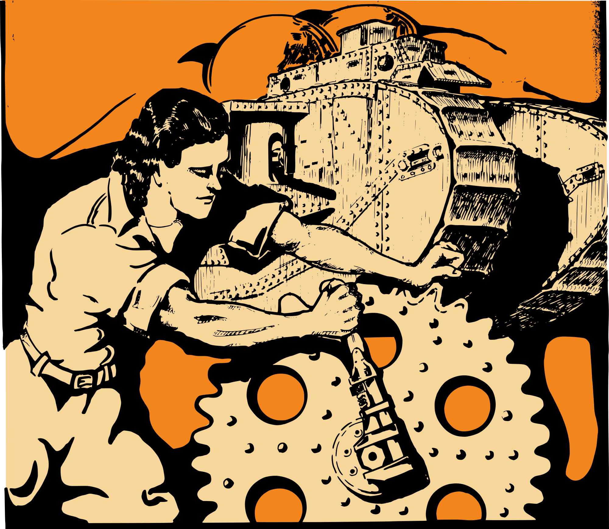 I wanted to synthesize a strong woman working, but it's hard to find a public domain source that highlights that because of different attitudes a 100 years ago. So I modified a public domain propaganda poster from a long time ago, and I came up with this. I hope it works somehow!
