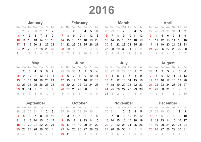 Full year grid of monthly calendars for 2016
