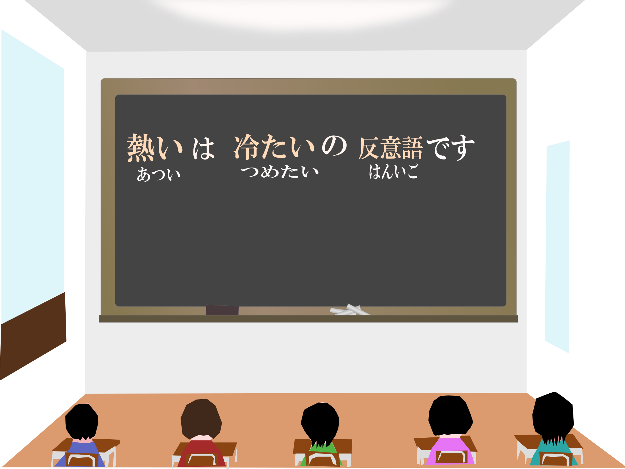 a kanji sentence which is pronounced as "atui ha tumetai no hanigo desu" and means ["hot" is the antonym of "cold"]