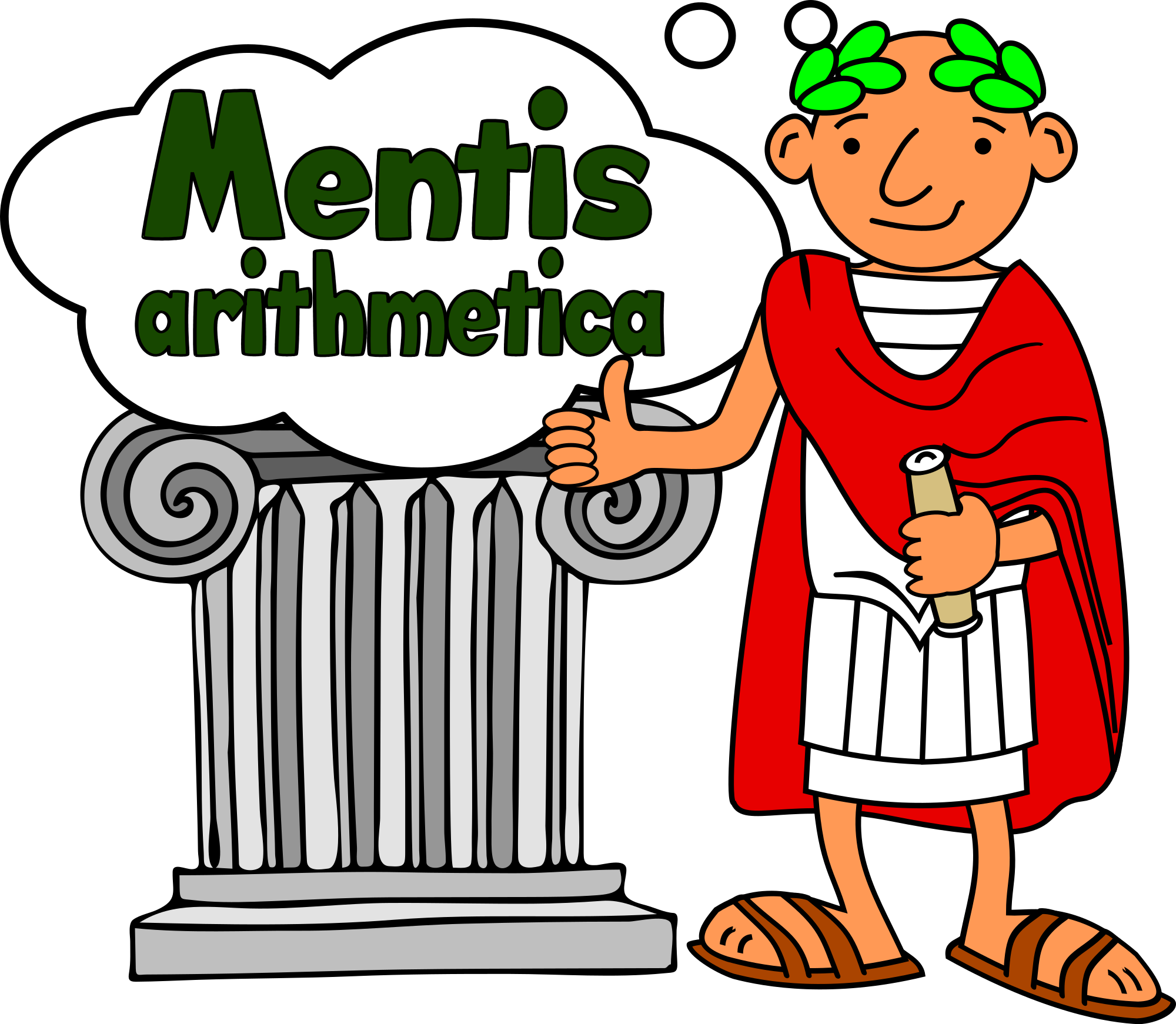 A roman emperor holding a scroll standing beside a column and seeming to think of / praise a mathematic mind.