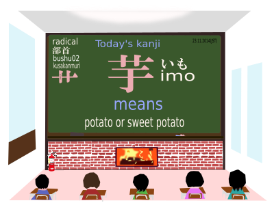 a kanji which is read as "imo" and means "potato or sweet potato" and includes a radical or bushu called "kusakanmuri"
