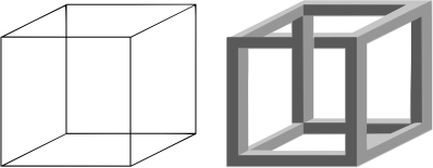 An example of a necker cube and an Impossible cube (one arm runs across the other but is still straight, which can't happen in 3D; it's an optical illusion).