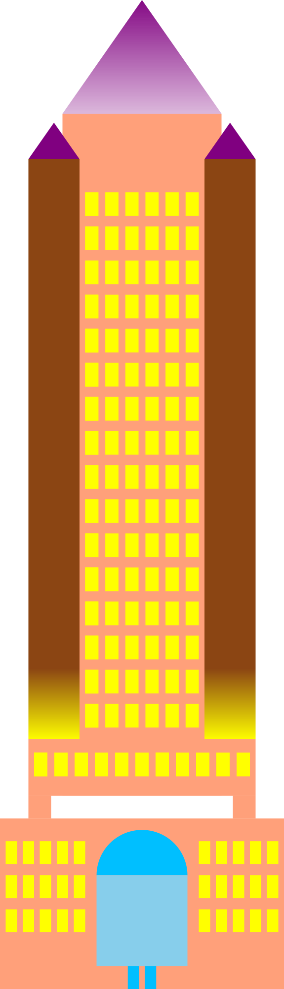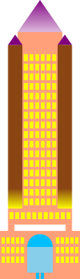 This building is called "Pyramid Tower" or "Pyramid Plaza" because it is topped by one big pyramid in the middie and four smaller pyramids at each corner (only two are seen because this is 2D)