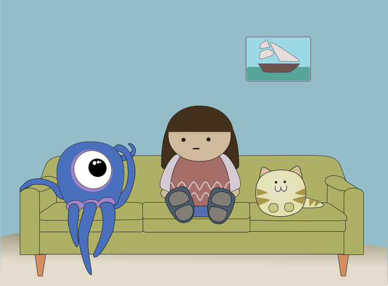 A girl relaxing on the sofa in a living room with a cat and an alien visitor.