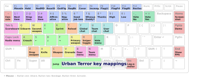 Keyboard with the keys marked with the keybindings of "Urban Terror" (a first person shooter) game.