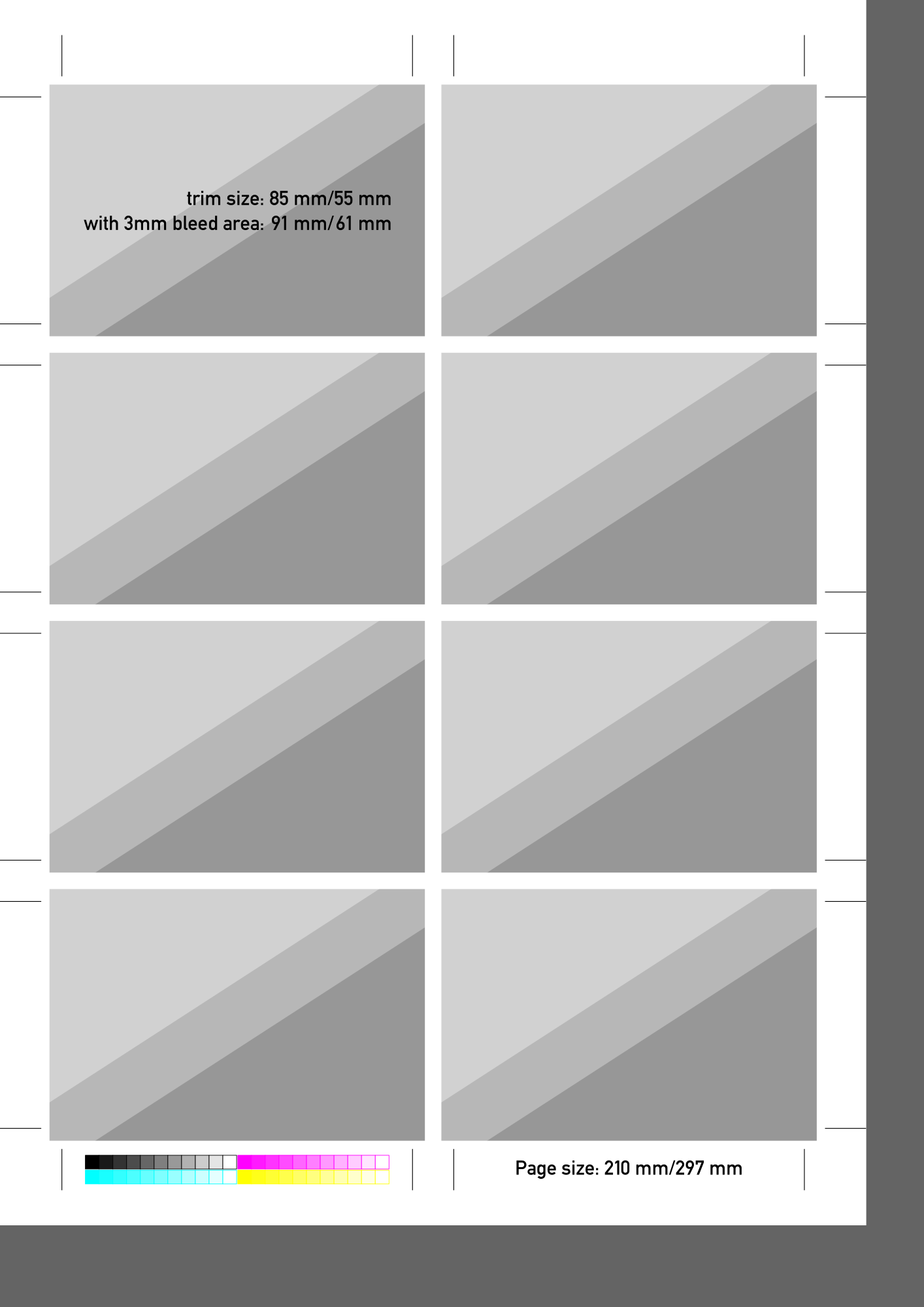 Crop marks are set up for a 85mm/55mm trimmed size.
