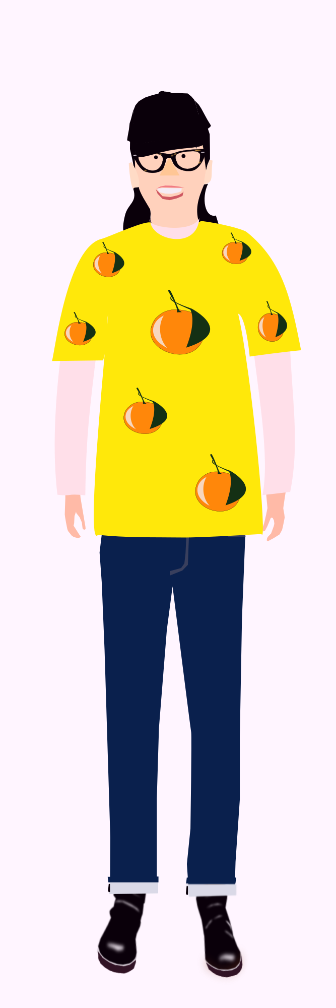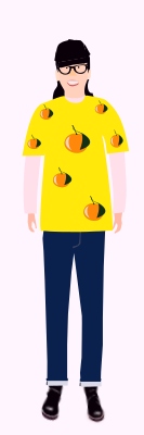 The image of a female who is wearing a t-shirt with oranges as pattern.Her name is "Asako" who is a imaginary character and has been an avatar of "yamachem 2" now.