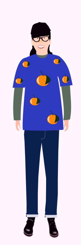 The image of a female who is wearing a t-shirt with oranges as pattern.Her name is "Asako" who is a imaginary character and has been an avatar of "yamachem 2" now.