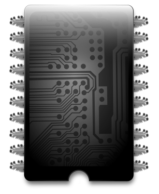 Biochip v10 with a black etched circuit board on the body and pins of the IC. This is a layered image. License: Public Domain