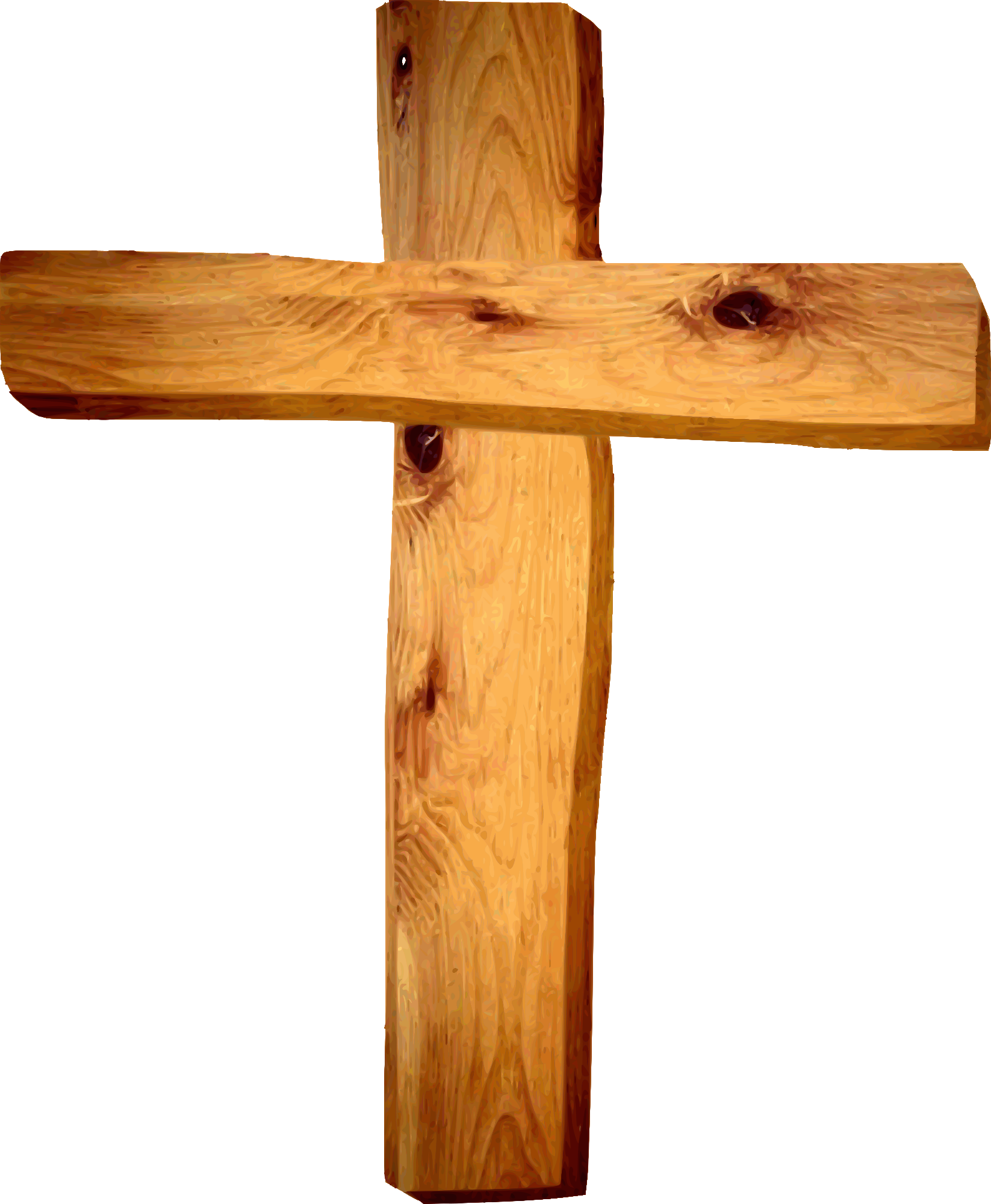 Wooden cross created using paths and wood-grain fill in PhotoImpact 10 to 12 years ago. The only survivor from those days is a 480px tall bitmap (png) image. It had some bitmap artefacts that I cleaned up in GIMP before tracing. In Inkscape I used 'Trace Bitmap' -> 'Color', 128 'Scans' & 'Remove Background'.