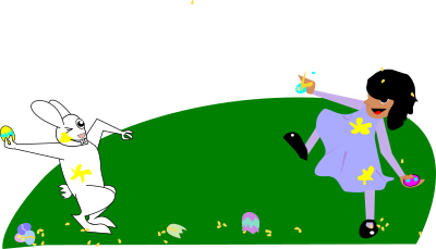 A girl in a dress having an Easter egg fight with the Easter Bunny. Edit: Fixed bad crop, added some eggs.