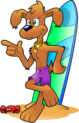 A surfer dog on a beach