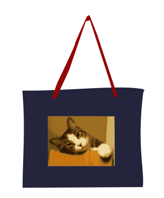 The image of a tote-bag printed with the image of cat. The main color is blue. The handle color is red.