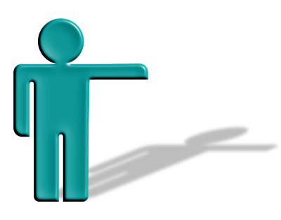 A bluish green man with his hand to the right or stage left.