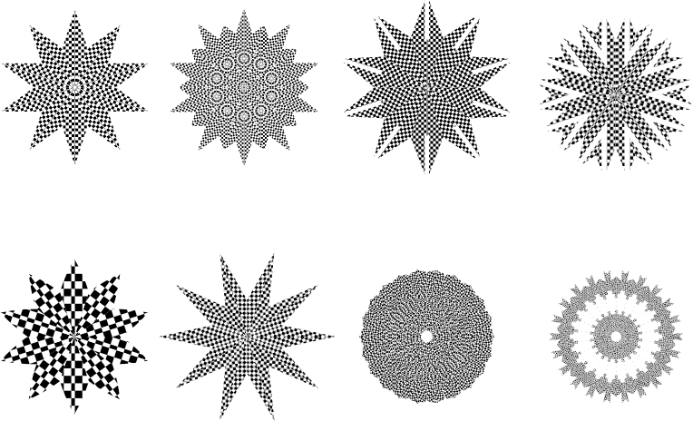 8 checkerboard geometric shapes. Does not seem to render properly in Firefox but works in Chrome-based browsers.