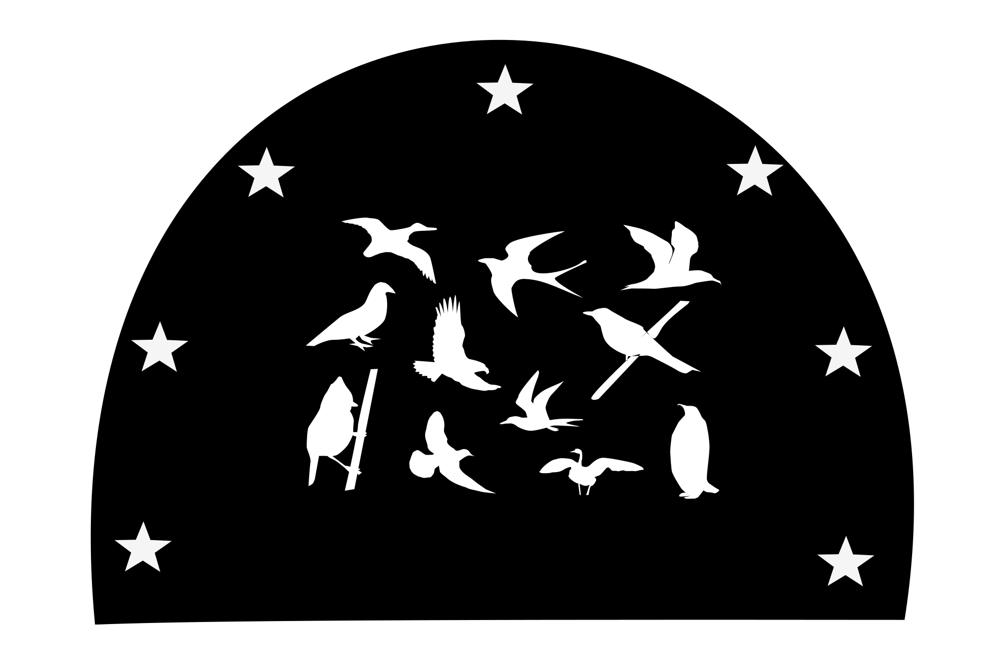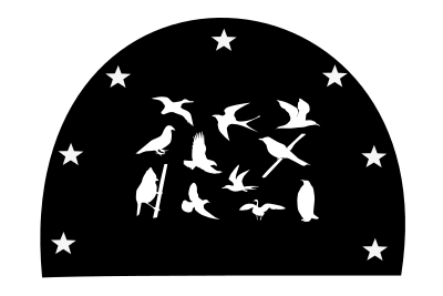 The image is bird silhouettes and seven stars.