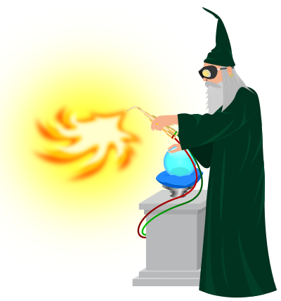 Wizard holding a blow torch and using his crystal ball for an unknown purpose.
