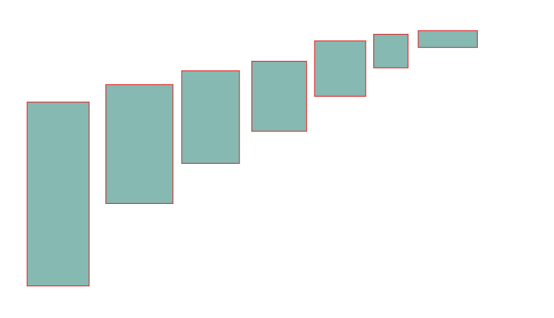 7 boxes changing scales to smaller from bottom left upwards to bottom right.