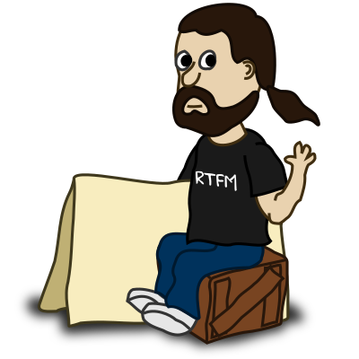 Comic characters: a bearded guy sitting on a wooden box
