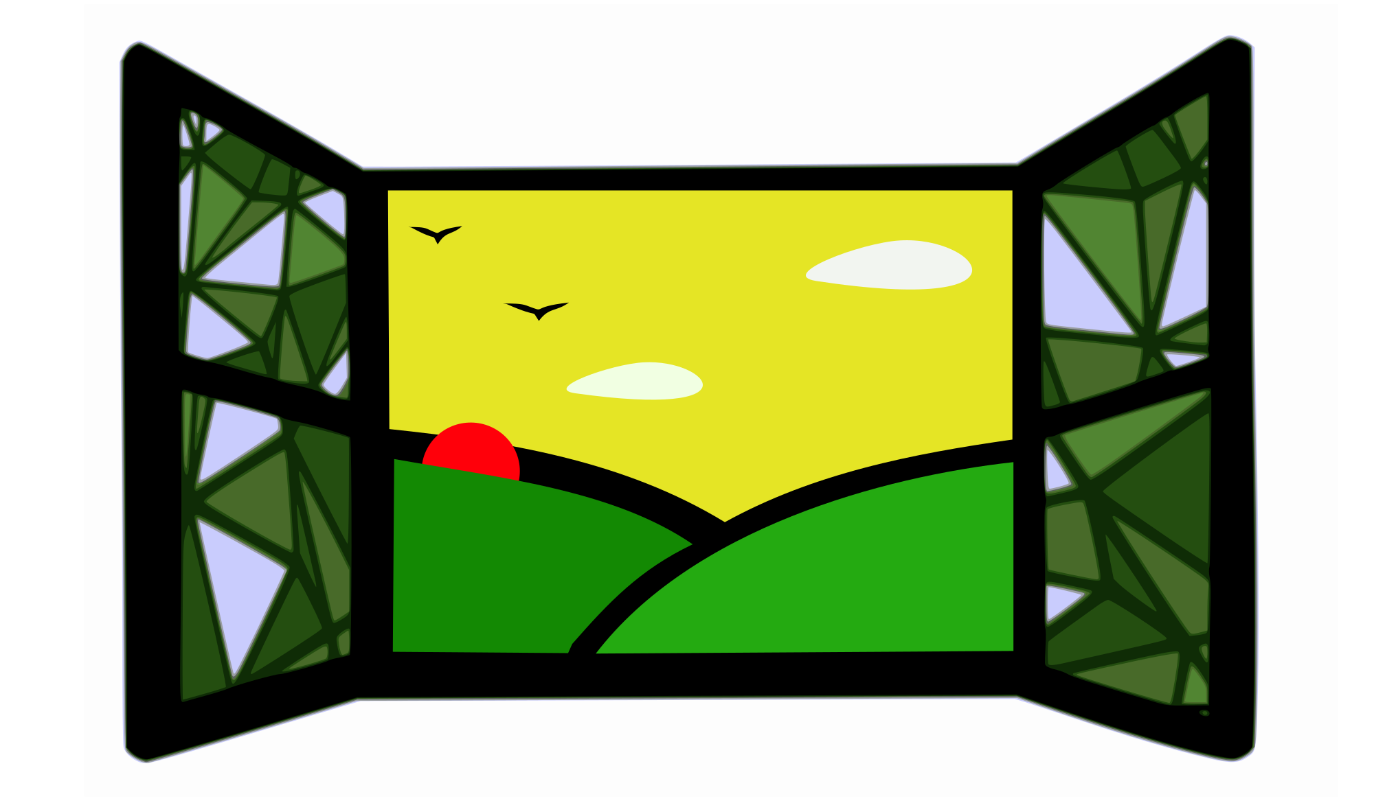 The image is a window which has a sunrise scene which includes the mountains in green and a red sun and white clouds and the silhouettes of two birds like crows .