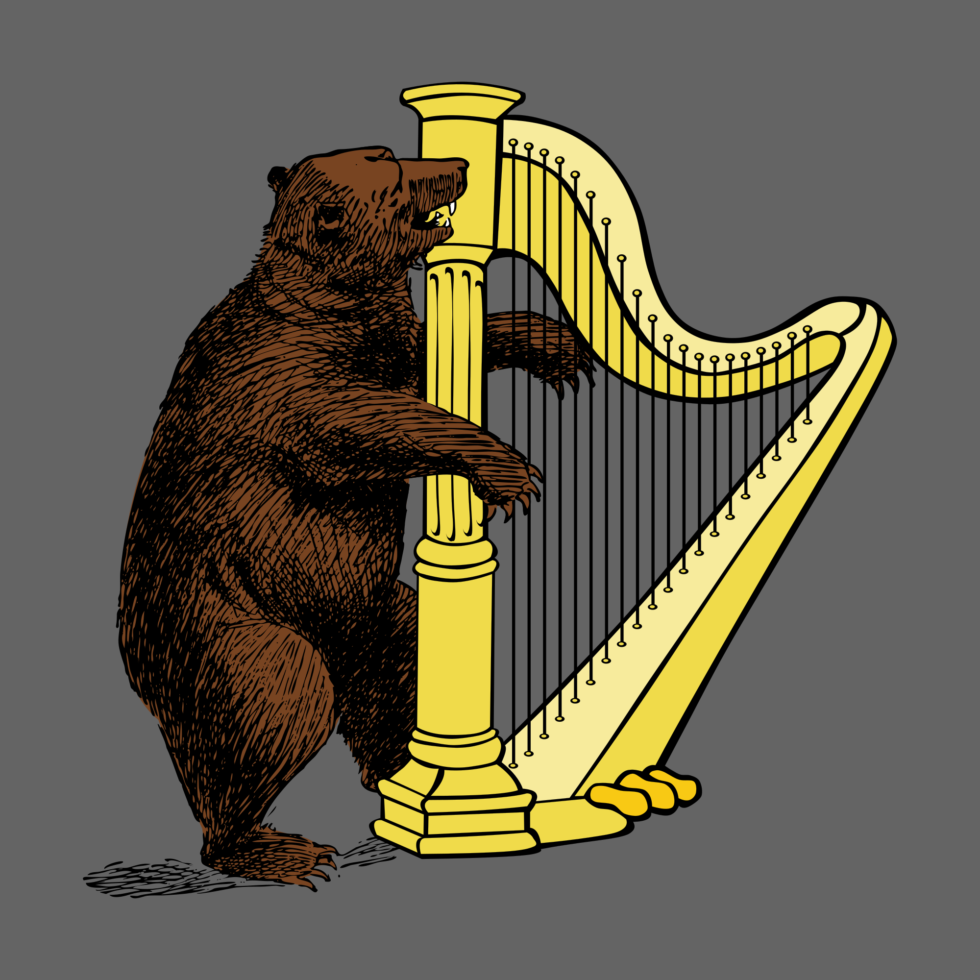 Bear playing on a harp.