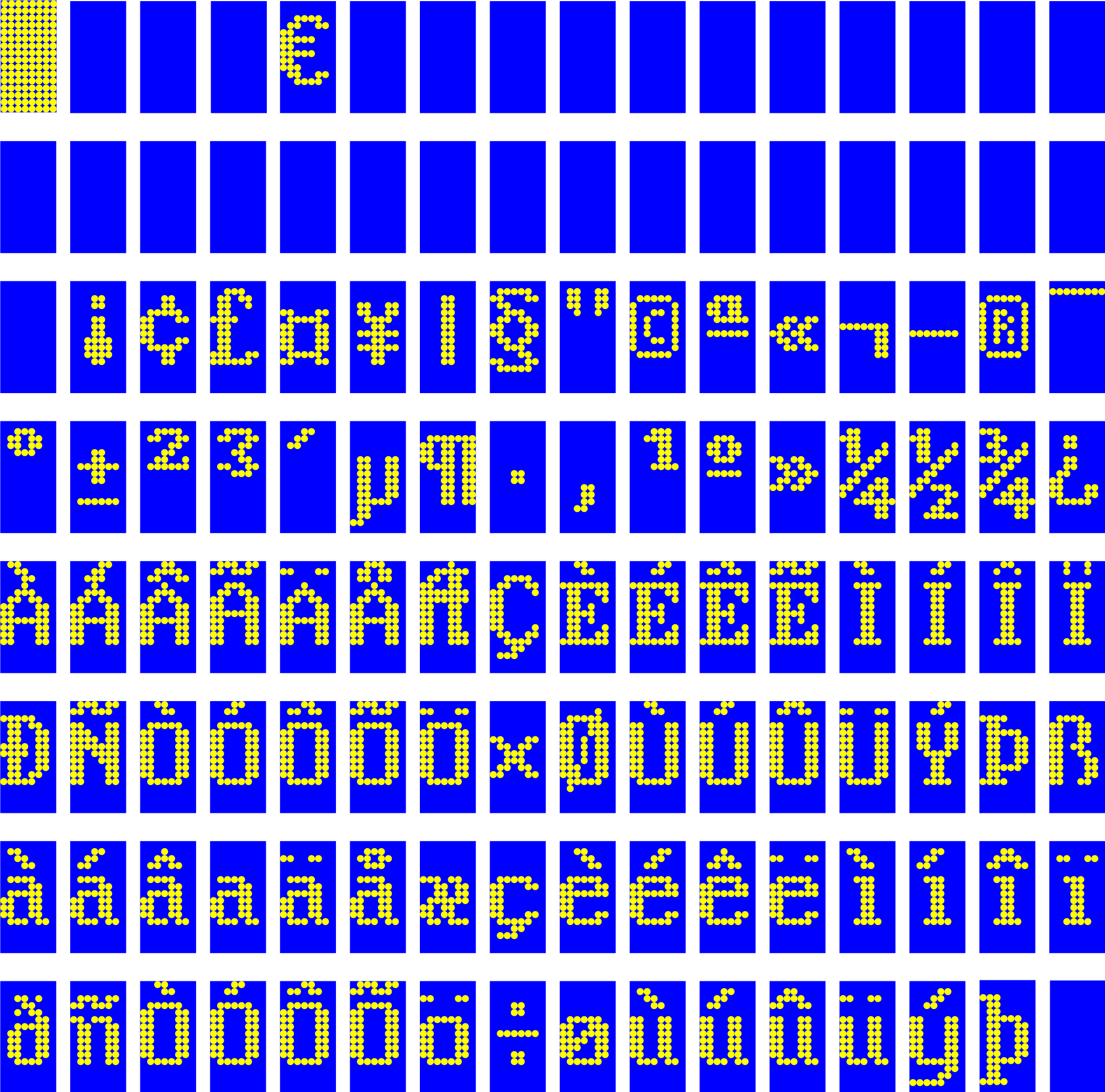 This is a collection of some upper, printable ascii codes (128-255), maybe close to ISO-latin-1 with yellow dots (filled circles) on blue ground.