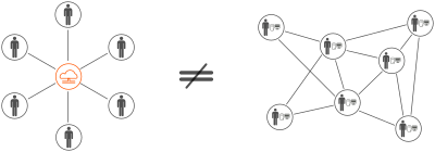 A comparison between a centralized network and a decentralized one (in fact, a distributed one).Cloud/Desktop icons from 183969 by rg1024.