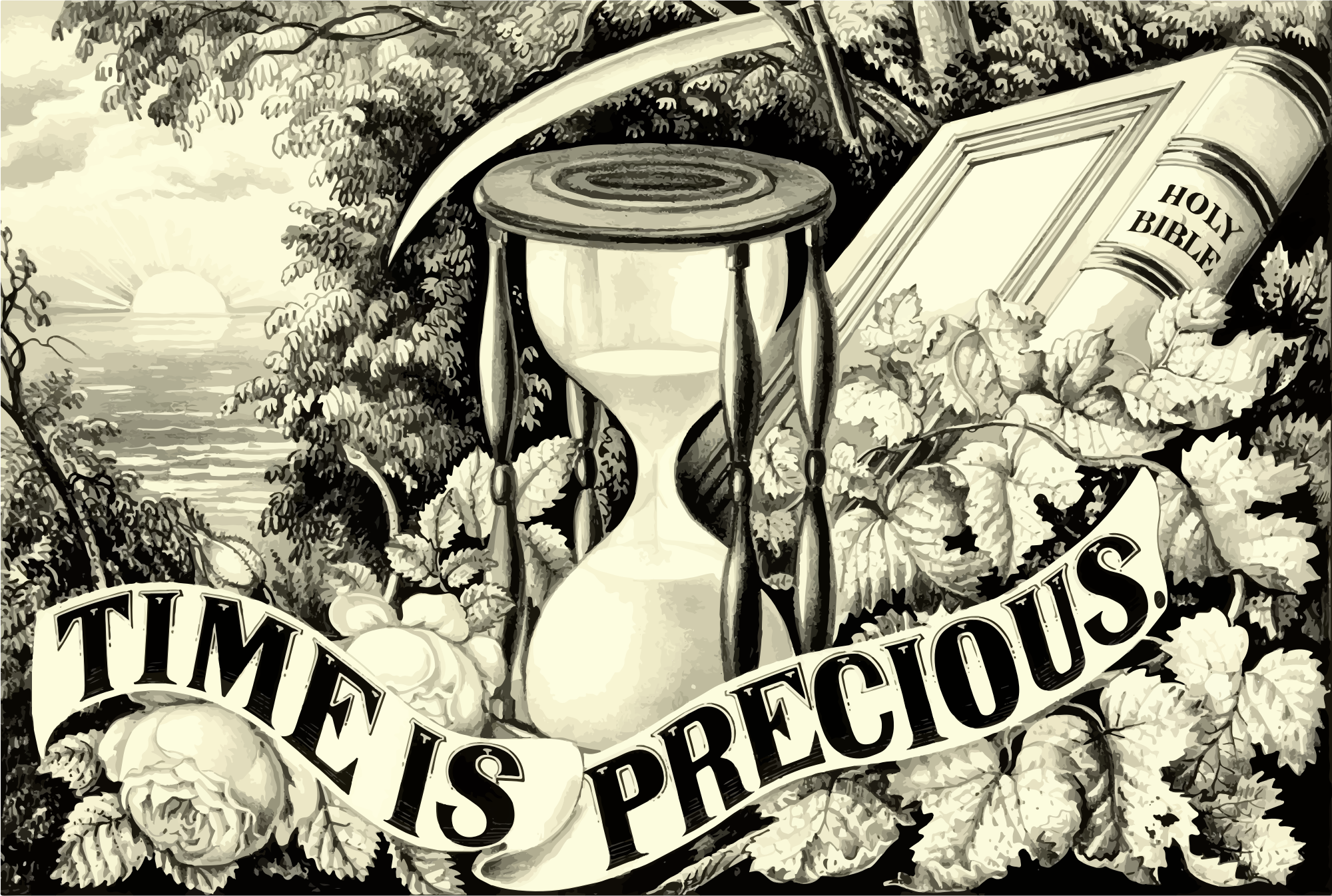 - Bible Flowers Grayscale Hourglass Illustration Landscape Scythe Time Is Precious Vintage