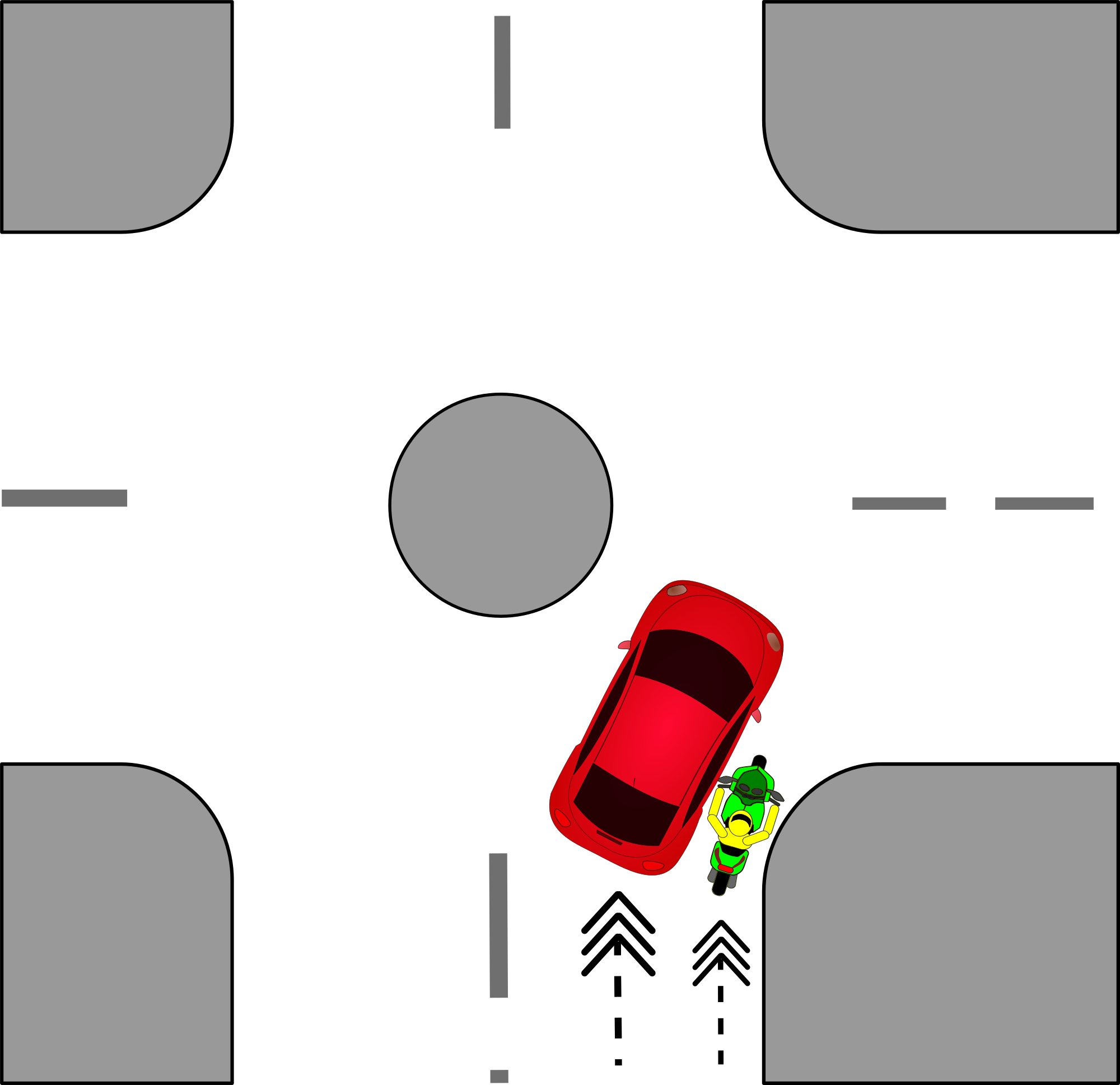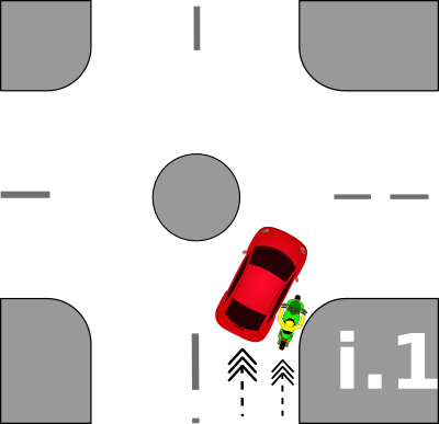 One traffic accident scenario with a car and motorcycle.