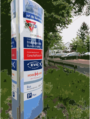 Shaped like an advertising column, this signpost allows people to find various organizations in this area.