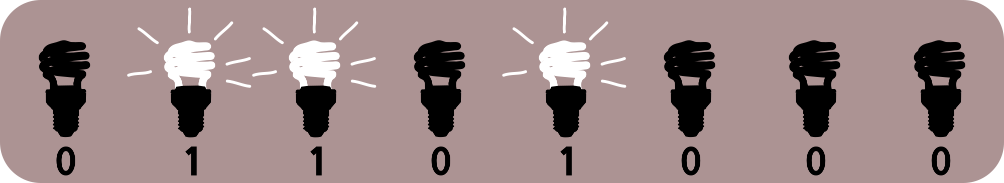 A graphical representation of an eight-bit binary string (a byte) with compact fluorescent light (CFL) bulbs; 0 is OFF, 1 is ON. Derived from https://openclipart.org/detail/211232/compact-fluorescent-light-bulb by jhnri4