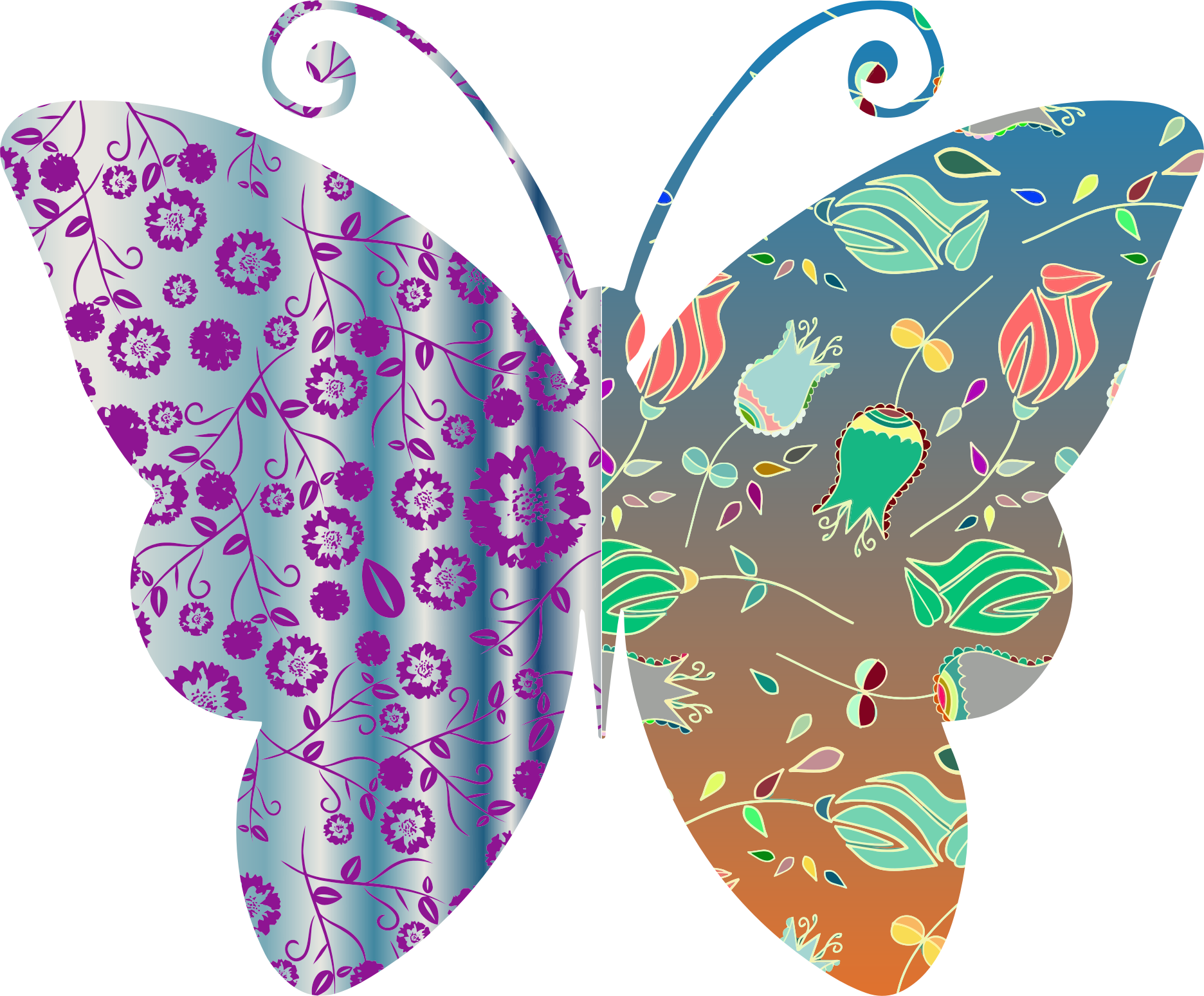 A butterfly filled with two vintage-style patterns, split down the middle.