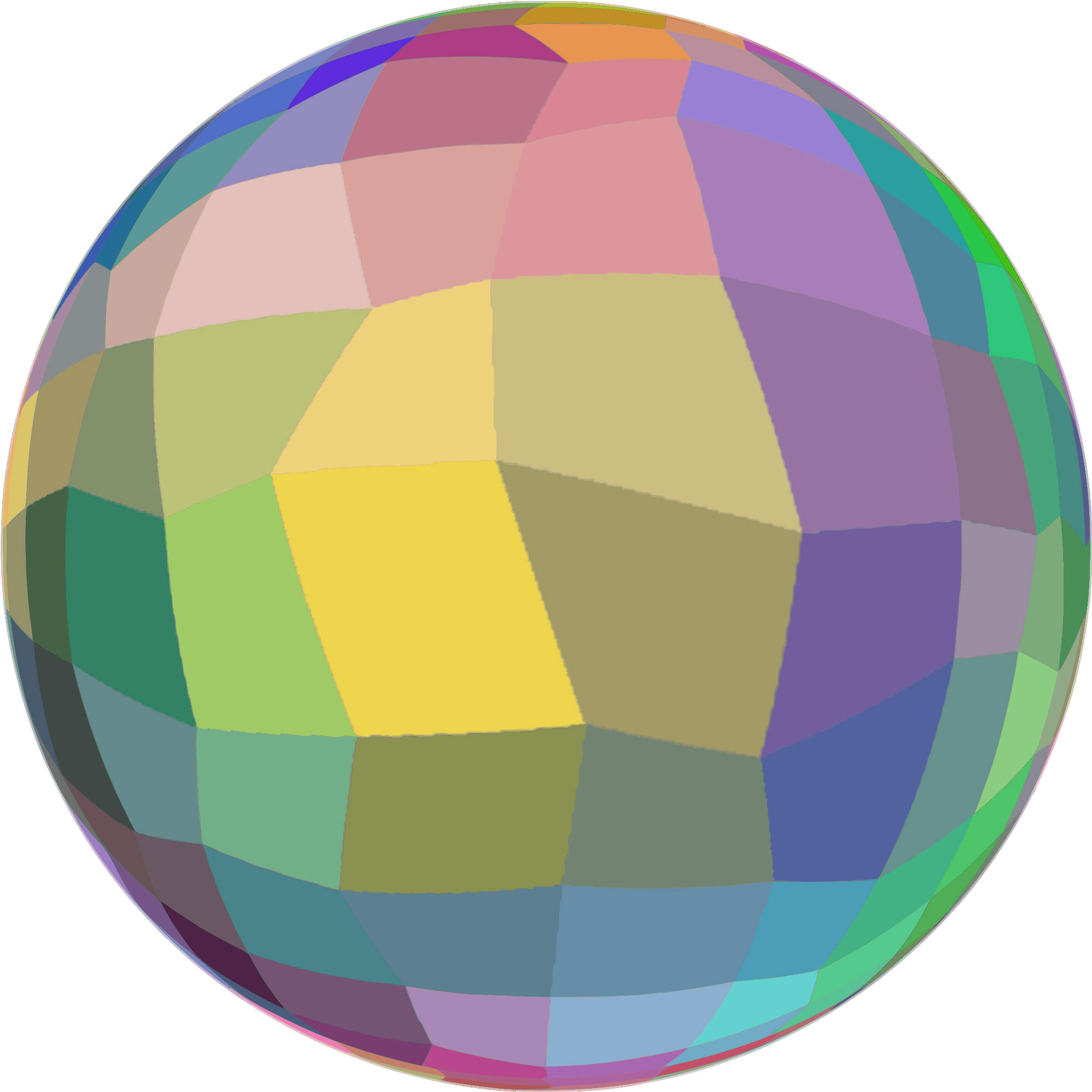 A sphere with a random mosaic pattern. Drawn in paint.net using a combination of 'Random Shapes', 'Mosaic' and 'TRs Fisheye' plugins and then vectorized in Inkscape.