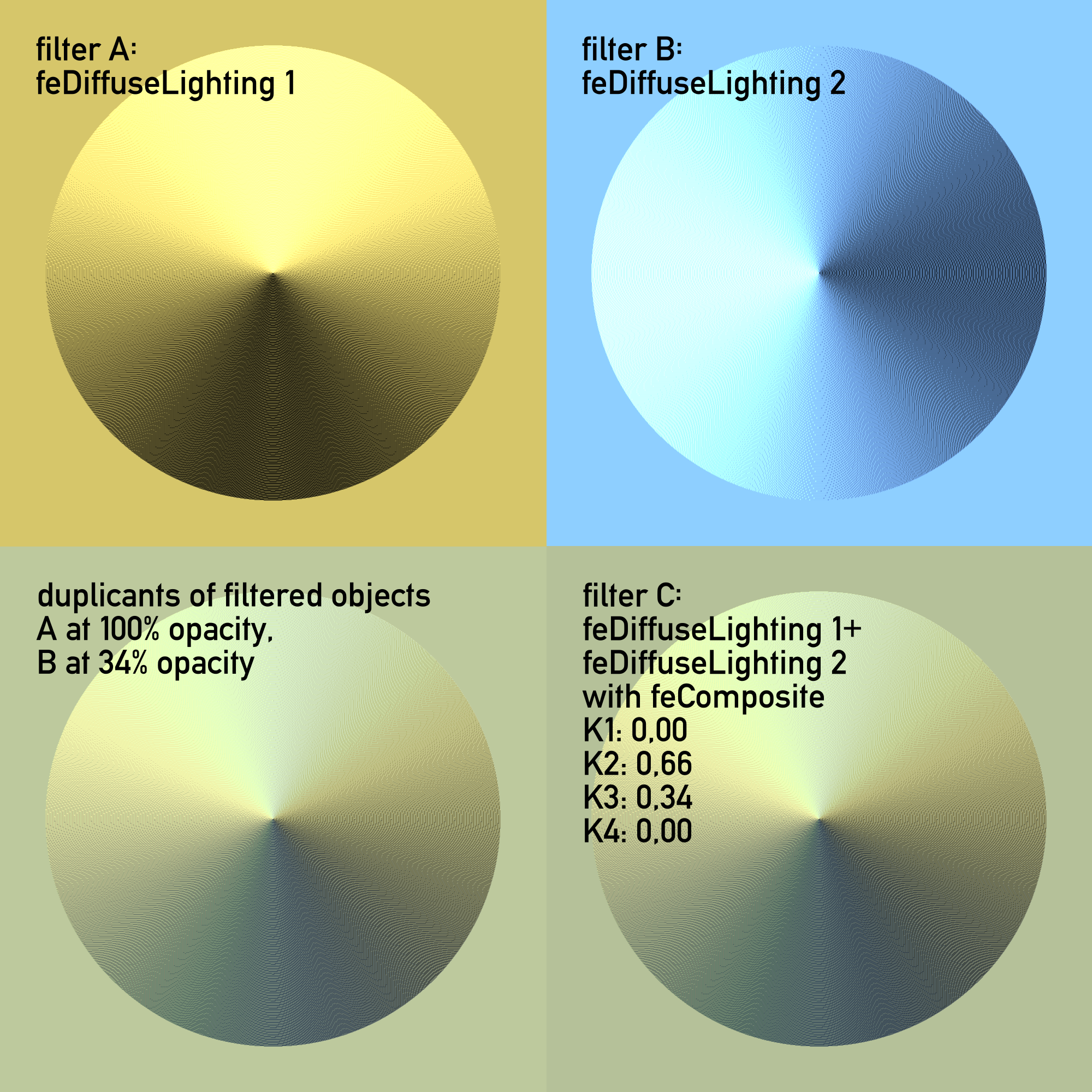 With feComposite, no need to duplicate the objects and make twice as much filters for the same effect, good to know.