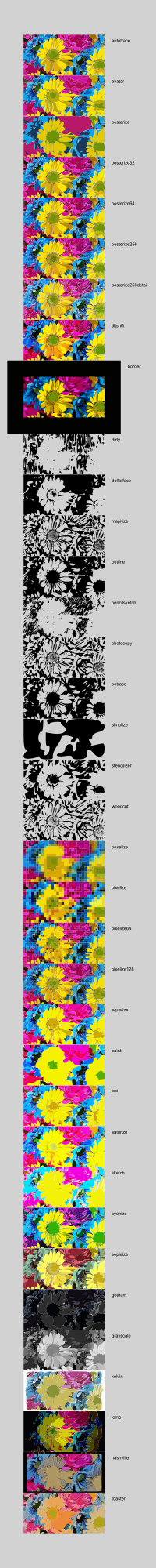 Send a mail with a raster image attached to -filter name-@openclipart.org, to try them out yourself.