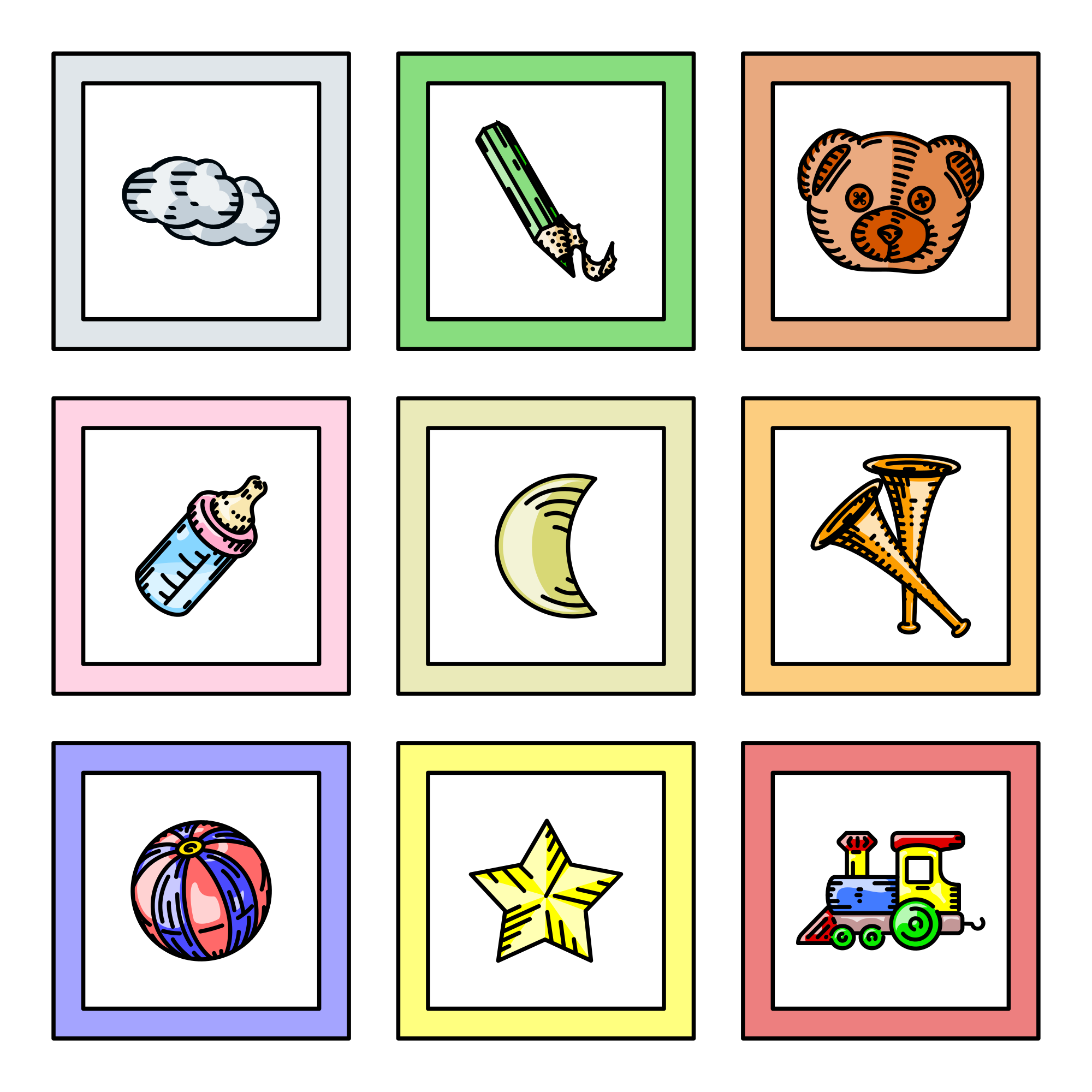 - Color Icons baby baby bottle ballon cloud horn moon pencil star teddy bear toy train