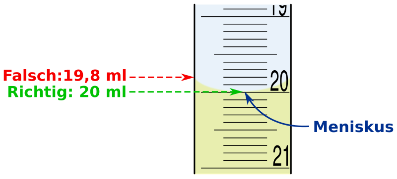 Meniskus richtig ablesen (gelbe Flüssigkeit) - Skala von oben nach unten