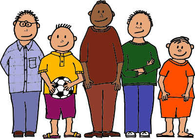 a lineup of five young boys, one is holding a soccer ball, they are smiling; this was initially an illustration for a math-puzzle so two boys are of equal hight and all others have their own height respectively