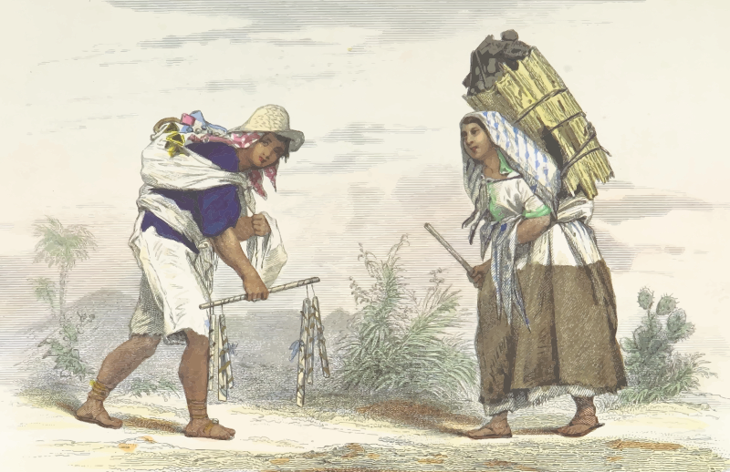 An Indian (left) and a coal merchant (right). From a drawing in 'L'Amérique centrale et méridionale', Louis Enault, 1867.