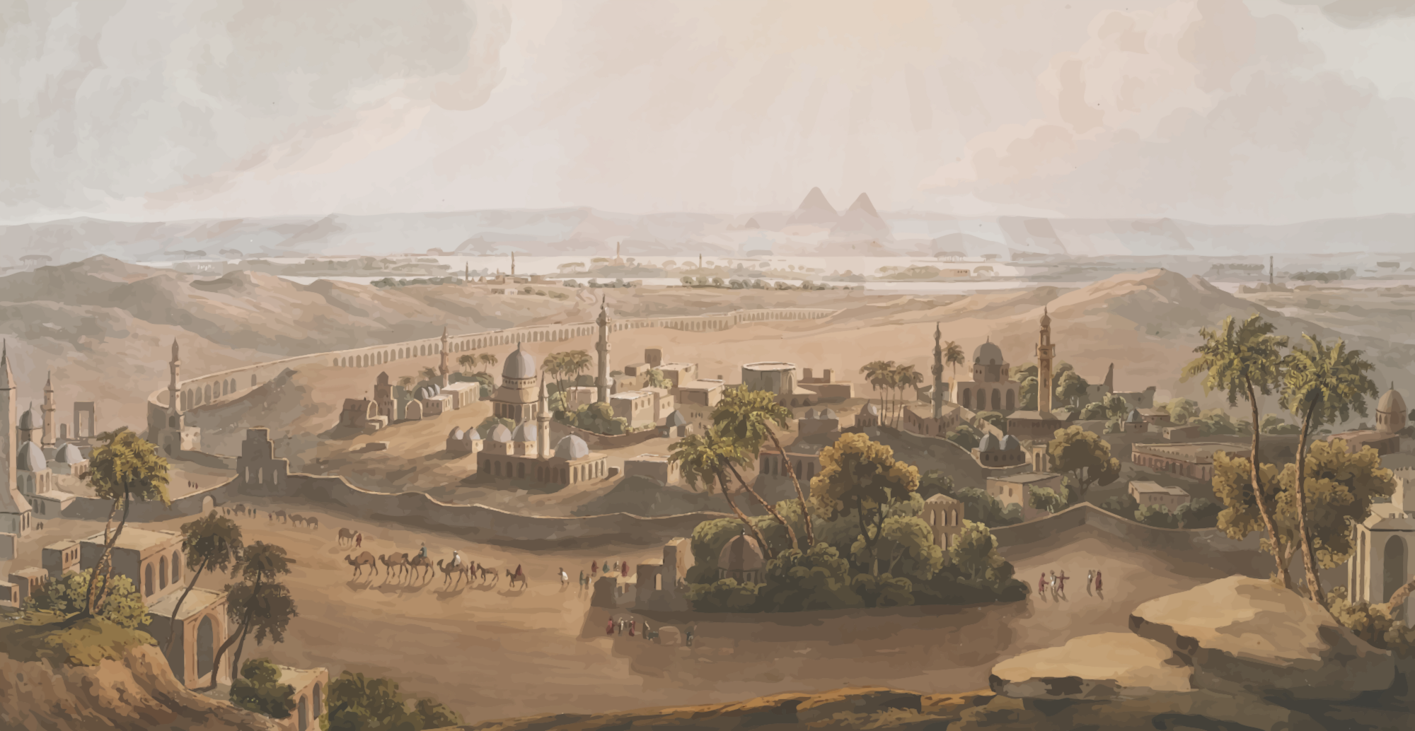 Part of Cairo with the pyramids in the background. From a drawing in 'Twenty-four Views taken in St. Helena, the Cape, India, Ceylon, Abyssinia, and Egypt', S. Rawle, 1807.