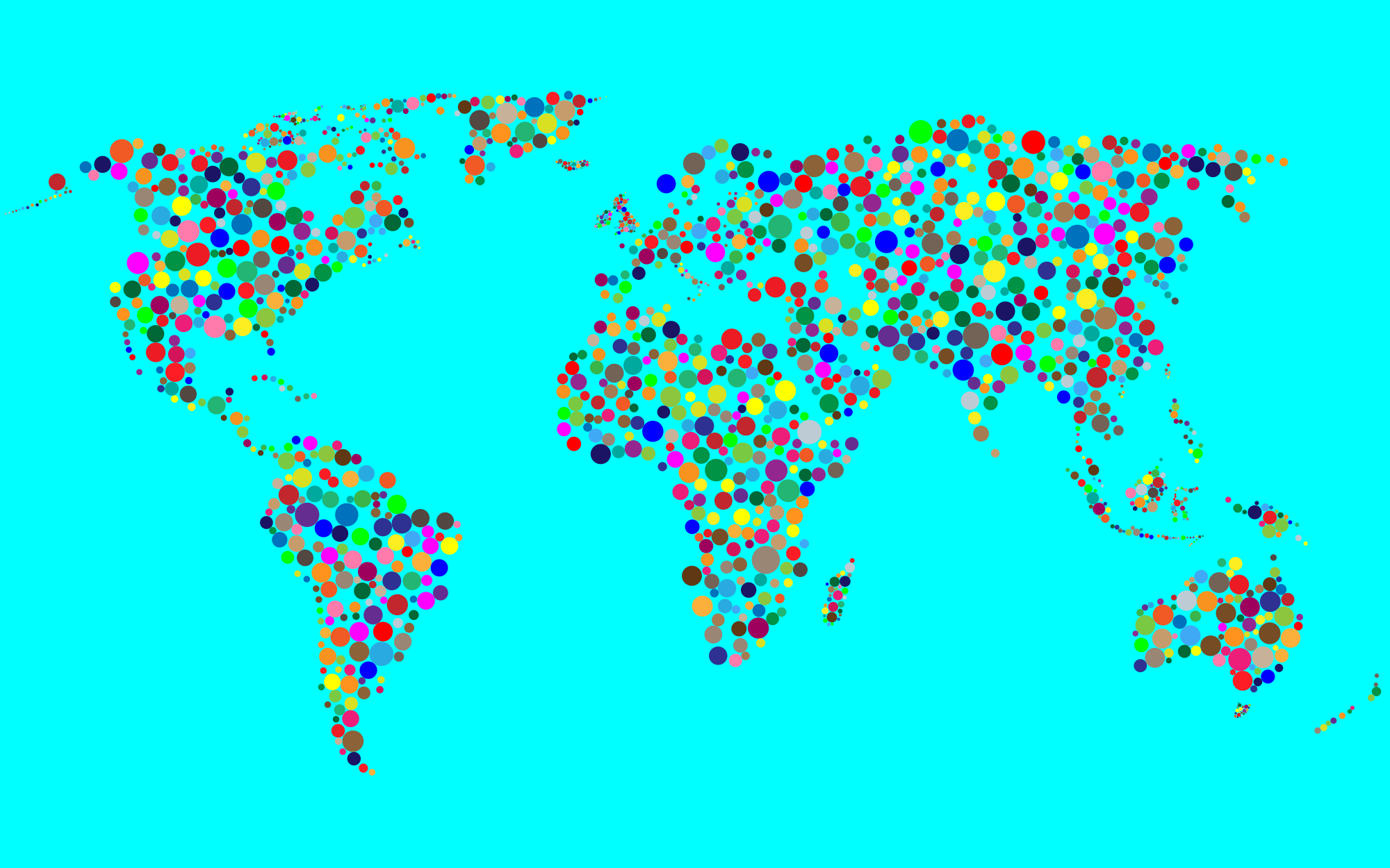 Map of Earth rendered with colorful circles, with a solid color background.