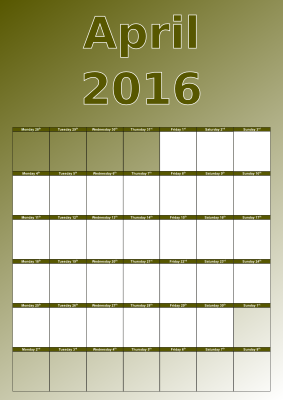 2016 April calendar month monthly