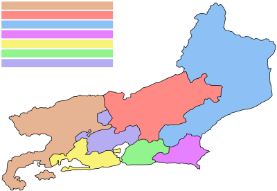 Map of the state of Rio de Janeiro, located in Brazil. It shows also the regions.