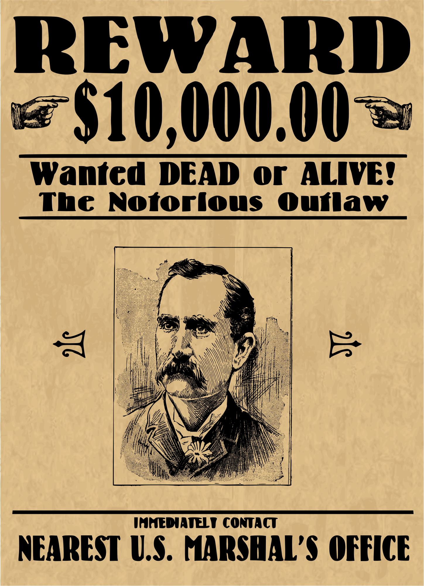 This is a "WANTED DEAD OR ALIVE" style cowboy poster with a face on it if you want to have one you could use for decoration for a party or a bar or in the background of a movie you are making.. or whatever other reason you would want a fake cowboy wanted poster. Yeehaw!