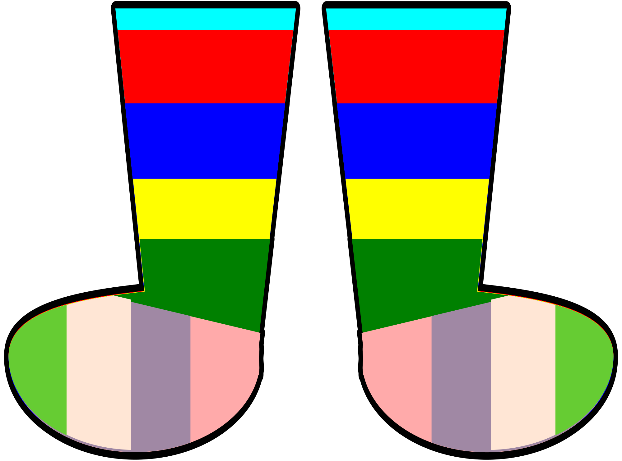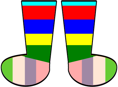A pair of rainbow socks. Forgive me if you don't like the colors. They're easy to change in Inkscape. Each color is a shape. Just select it, change the fill, and voila.