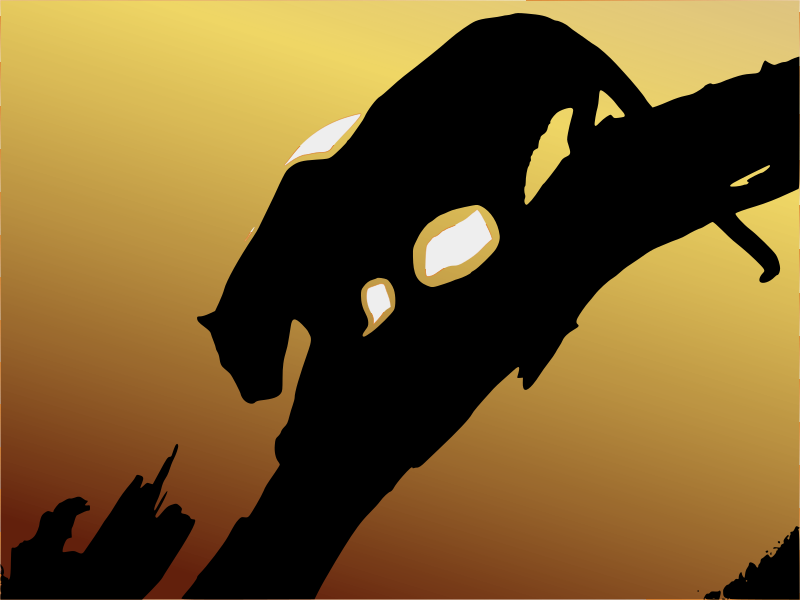 A black panther silhouette on a tree at sunset.