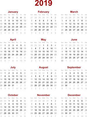 Yearly calendar for 2019.