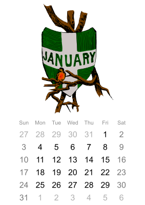 An illustrated monthly calendar for January 2016.