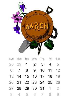 An illustrated monthly calendar for March 2016.