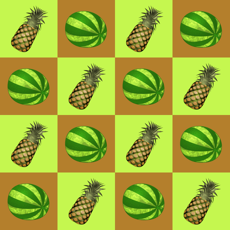 A chequerboard pattern with a fruit theme. The fruits are from postings by Keistutis.